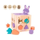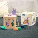 Juguete educativo de madera, denominado 'Rabbit' que contiene 17 piezas y un cubo con tapa para poder extraer las piezas una vez depositadas en su interior.